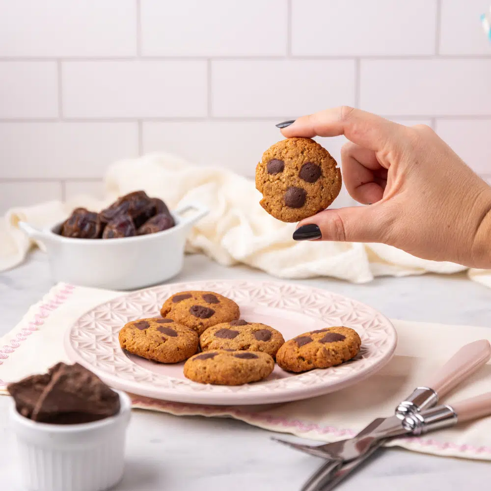 Ingredientes: Tâmara MedJoul, Chocolate Gobeche 50% sem acúcar e sem adoçante, Farinha de Aveia, Castanha de Caju Crua, Óleo de Girassol, Água, Farinha de Linhaça Dourada, Fermento Químico e Sal.