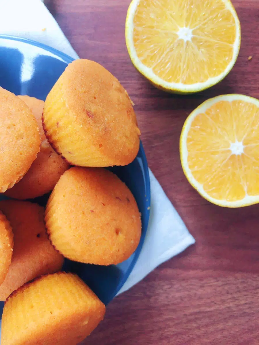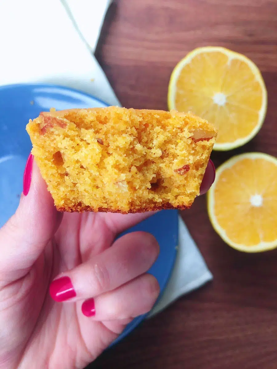 Laranja pera (suco), farinha de arroz integral, cenoura, açúcar demerara, óleo de coco, polvilho doce, fermento químico em pó, raspas de casca de laranja. – 4un